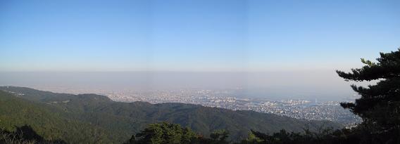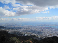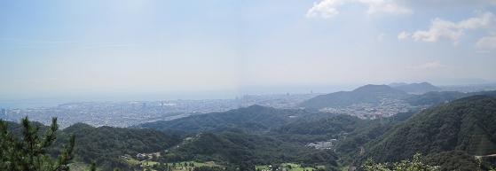 Mt. Hachibuse(9:30am) -> Looking toward east On the way to the top of the mountain, I had to stop for a rest because I was out of breath and sweating really bad. I looked around and saw the view toward Suma to the east and Akashi bridge to the west. It's nice to be I was passed by older man and lady while I was taking a break. They are climbing like a regular thing.