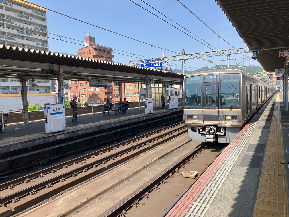 I passed the gate and moved up to the platform. The train going to Sannomiya came at 2:03pm and took 7 minutes to the destination. I just loved the view from the train running. No matter how many times I take the ride, buildings flying by