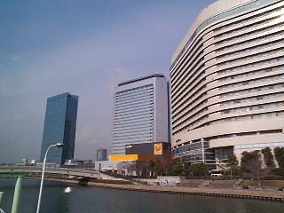 The building in the center is Osaka Amenity Park, and the Imperial Hotel