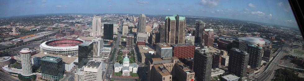 The west side look much more fun. The round shaped stadium is the "Busch Stadium" (Yes, beer...), used fro Major League Baseball. The old looking house in front of the arch is the "Old Courthouse", and to the far right, it is TWA Dome.