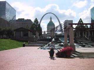 There is a park in the west side of the arch. I took a picture of my standing. (Too small to see?)