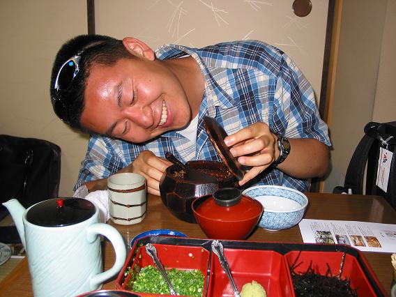 For the dinner, we went to a fairly good restaurant. This meal is called Hitsumabushi(R). It's seasoned eel with steamed rice. My friend told me that I have to take this one regularly twice (first without and second with seasonings), and the third one I have to mix with tea (you see the tea pot, right?) and the last one is my choice. The square box you see in the front contains seasonings (Green Onion, Wasabi and Seaweed)