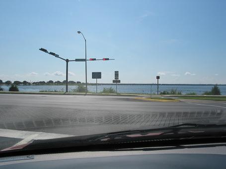 Soon you will be on the second bridge, when you see tow huge water tanks with dolphins written on it, you are about to pay a toll.