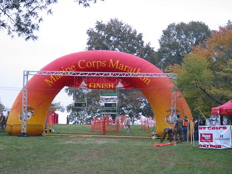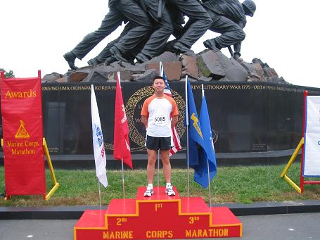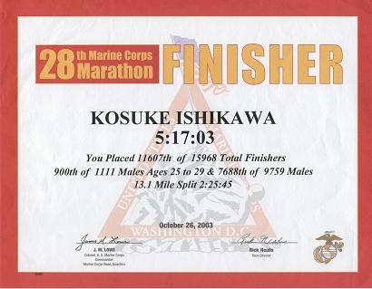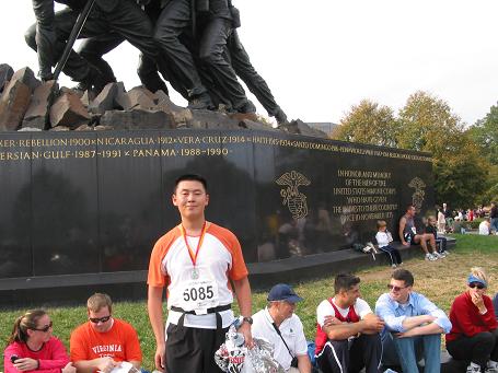 Finish race after 5:17 of struggle. It is almost impossible to express the feeling seeing the goal. I had to climb up the last 0.4 miles of the course, but I did not stop. One of the marines removed my chip from shoe, the other gave me the vinyl thing to keep body warm. Looks like everybody had to go through a point where pictures taken. Picked up my bag, ate some bananas and head back to the shuttle bus. I talked to some people on the bus, and was nice to do that. After arriving to the parking lot by the Pentagon, I had to wait for a while to get the bus which takes me back to the hotel I am staying. I came back to my room at 2:40pm. The first thing I did was not taking shower. I had to lay down a bit because I was so tired. About half hour later, I finally got up and took one. I had to give my email address to friends I met, so I stopped by their room after that. I had a late lunch at 4:00pm from McDonald's, started to rain outside but I did not care. My legs sore so I was walking very funny. I got two hamburgers, and medium fries. I did not want any pops at the time so rather than taking value meals, I just had them instead.