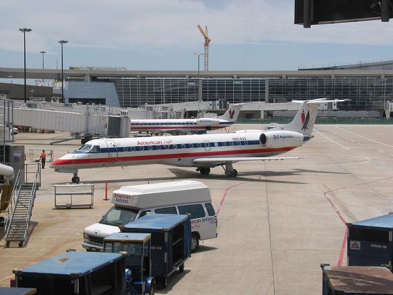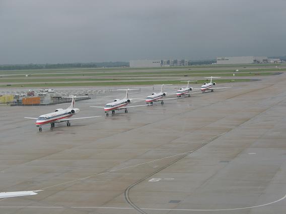 ERJs waiting in a line for their gates at DFW. "This is your captain speaking, we are currently waiting for the next available gate...."