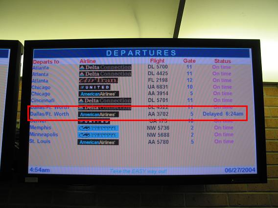 The airplane leaves Wichita at 6:00am arriving at DFW around 7:13am. The plane was expected to be late by 25 minutes even before I was going to the gate. Now the departure time is around 6:25am. The actual departure of the plane was around 6:40am.