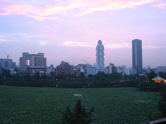 View from Who's Food Restaurant, the funny looking green is a lake called Shinobazu no Ike. The funny looking building is Yebisu building, I have no idea with the right one though.