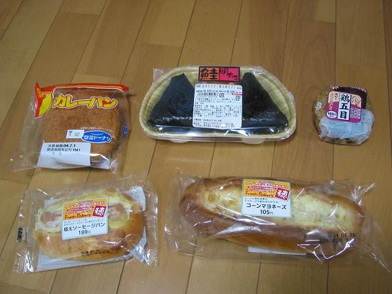 My food for the day. Clockwise from Top. Riceballs (Salmon, Spicy Fishegg), Another rice ball but with soysauce and chicken flavor. Corn & Mayo bread, Sausage bread, curry bread.