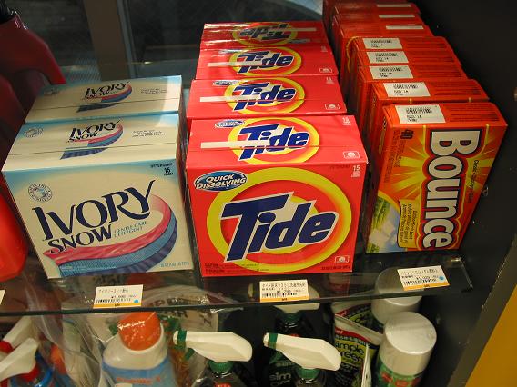 Ivory Snow 16 loads 1995Yen, 26oz, Tide 15loads, 33oz, 1785Yen Bounce 40 sheets 1029Yen