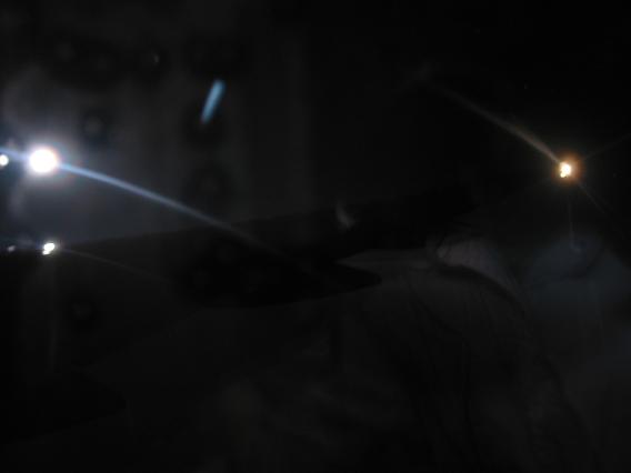 6 seconds exposure at F=2.0 in night shot. Left one is the moon and its reflection against the wing, the right one is anticollision light on right wing. (you will see my shirt, never mind...)