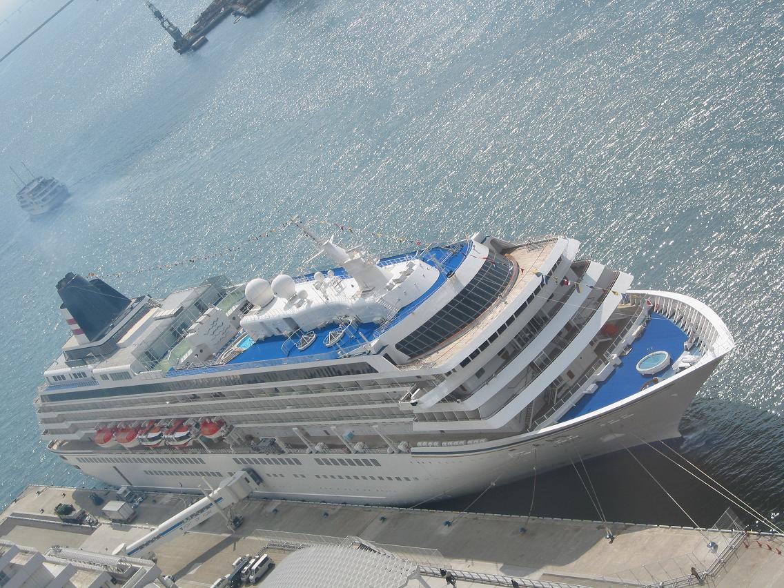When I got to the bay, I saw a crowd taking pictures. Not the Kobe port tower, but there was a cruise ship called Aska II, which recently christened and ready for the first voyage.