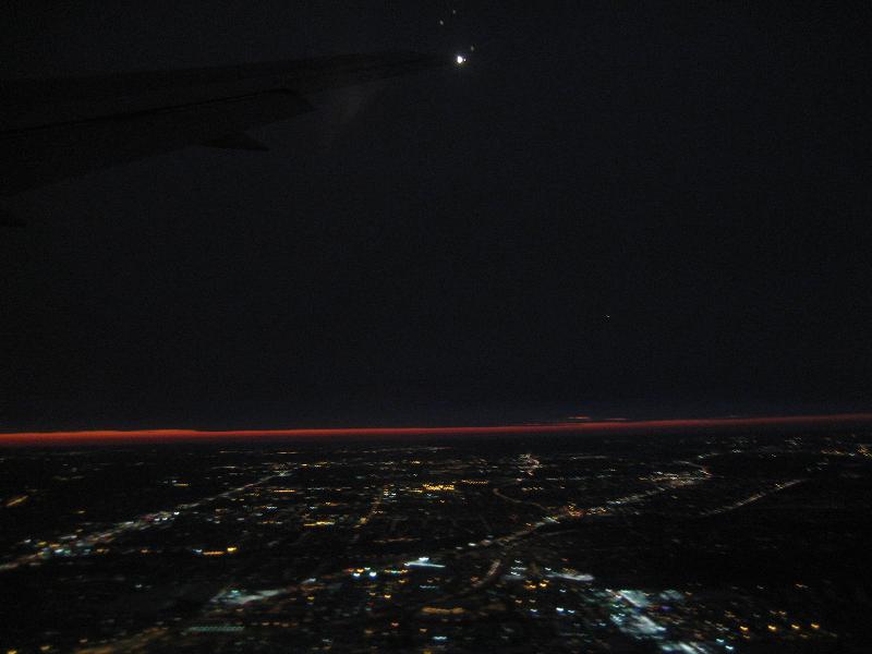 I got on board the plane. Thanks to my luck, the guy sitting next to me moved to find a better seat for sleeping (He was planning on reading book all the time...). After the departure, the plane had to taxi for a while and wait for a moment, The plane took in the air soon. The sunset was quite amazing although it was overcast. Completed turning to north east after reaching the Michigan lake. The plane flew over some cities over Canada, but I cannot tell which one. I took a nap just enough to keep me going for the rest of the day. The Boeing B767 I boarded did not have a good entertainment system unless I fly in the business class (no way I or the company could afford...). After passing the half of the flight leg, I saw a couple of lights on the ground but it was not possible to determine if it was what city. Only time I know where I was, was the time flying over overcastted London. It was a huge orange cloud. The plane approached to Brussels as it descends, I start to see the lights.