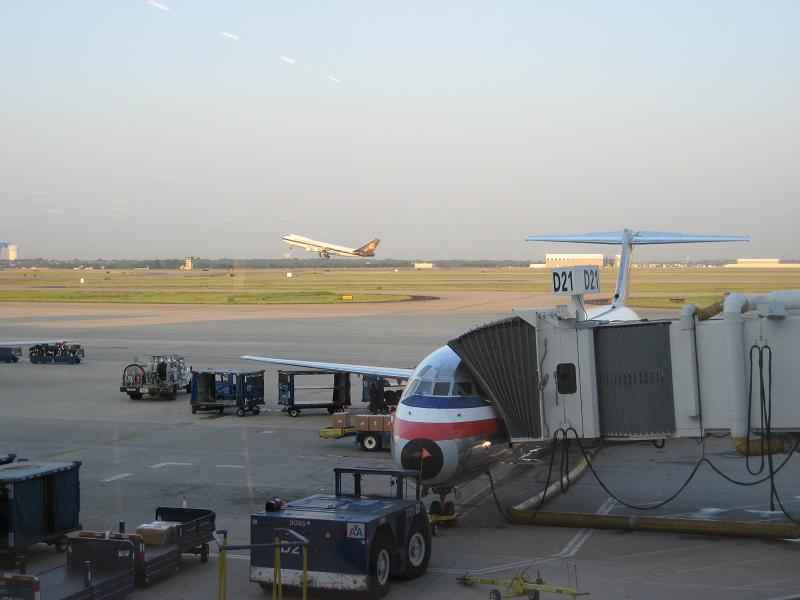 The plane departed to the south on time. Very much smooth ride toward the DFW, just few bumps. I wish I could tell where the position was since it was still dark. The only thing bright outside was a moon in the sky, and some city lights on the ground. I had nothing to do so I took many short naps but inside of the plane was too cold. After in the place for 2 hours, finally got up near Dallas Fort-Worth International airport. Arrived around 7:20am but was a bit too early so the jet bridge was not ready yet, stuck in front of the gate for about 5 minutes, and surrounding trucks could not move, either. Hahaha. I was just watching the Sun coming up from the horizon. After got out the plane, I am free from cold cabin for now. Dallas is sure still warm.