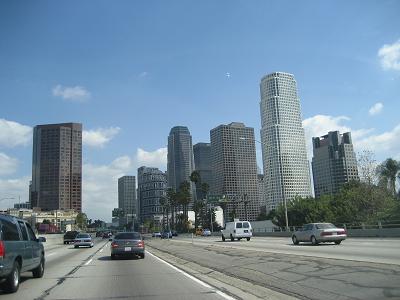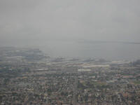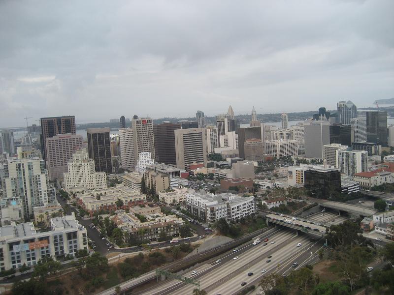 I was already informed on the connecting gate information, so took Skyline to the Gate D. Watching the planes taking off and landing as moving to the terminal. While waiting in front of gate, I checked out Sony’s vending machine containing PSP, and its software, MP3 players and memory sticks, DVD-Rs. I know there are similar ones selling iPods and other items. I think tricked out automatic vending machines are getting popular these days. You can use credit card, and airport is sometimes boring. What a nice opportunity for those companies wanting to sell stuffs. After getting onboard, the plane departed to the south on time again, seeing many wind firms right after taking off, imagining myself what oil rich state like Texas is doing. For the environment? Or for the future? The plane took smooth ride to the west, after 2.5 hours, the plane finally starting to descend. Unfortunately, the destination was under cloudy sky. I got to see the much of downtown area before the landing. Arriving at the gate around 9:20am. I am so ready to get out and go sightseeing.