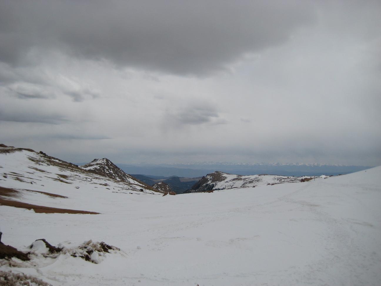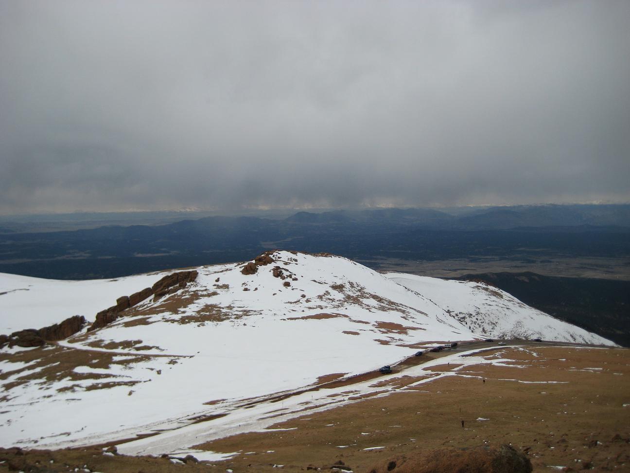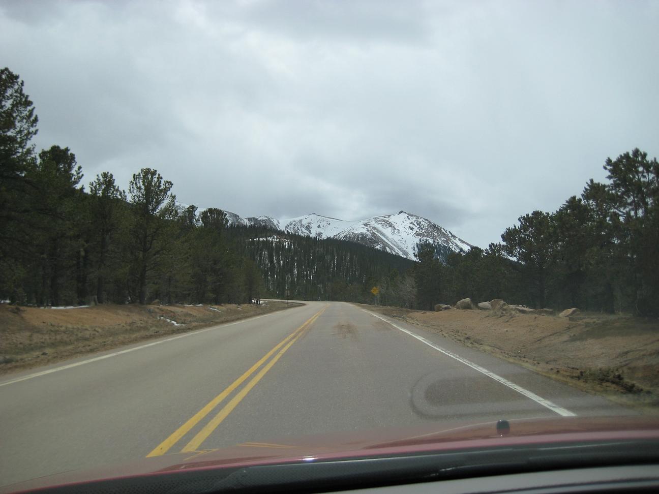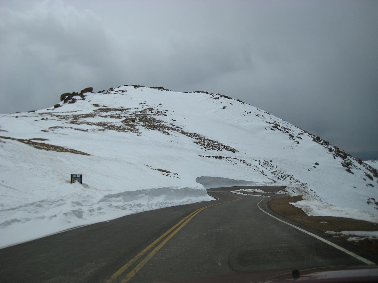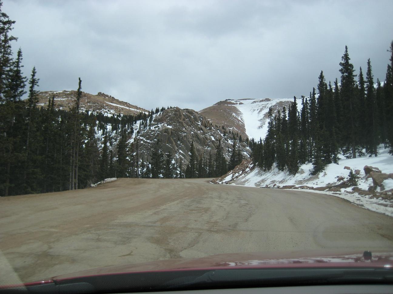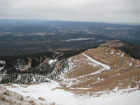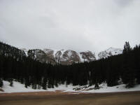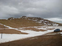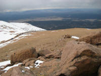 drive up slowly, made stops to take pictures, also I picked up a guy on the way who wants to go back up and ski down. It was nice talking with him. He used to live in Detroit. Reached at 16 miles mark, see a park ranger blocked the way, so I had no choice but climbing up at Devil's playground. Which is at 13,000ft. I could see the summit which I cannot go... The weather was not well, I needed a wind proof jacket. No rain was falling but I did not like the condition. I get to see some people going down the hill with ski and snowboard Stopped at a lake for a while While I was trying to climb up, I was totally out of breath, had hard time climbing up, but I made it through. I could taste the all different symptoms of altitude sickness, shortness of breath, dizziness, headache, loss of balance. After reaching to the highest point there, I looked around and saw the weather is coming down, Stated to head down after 2:30PM, got to I-25 by 4:00PM, by the time when I got back from the road, my headache is getting better. The rule on the downhill portion of Pike Peak is to put the gear at lowest to prevent the brake to have vapor developed inside of