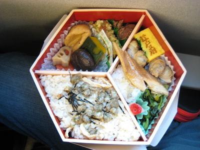 My dinner "Tokusen Bento Tokyo" for 1,000Yen The contents Alcohol boiled corbiculae on top of steamed rice, seasoned horse mackerel, broiled clam, egg, shiitake, pumpkin, lotus root and others After getting to Nagoya station, used a subway to go to the station nearby my home, switched to public bus. I come home around 7:50pm, my dad answered the door, used to be my mom's job. Looking at tired looking dad, must be very stressful for the last few days, my grandma was as usual, don't remember anything about me. Unlike last time, she was curious instead of worry while she was watching me. Her autism is progressed greatly, I guess. Had hot bath, chat with my dad, went to bed around 10:00pm.