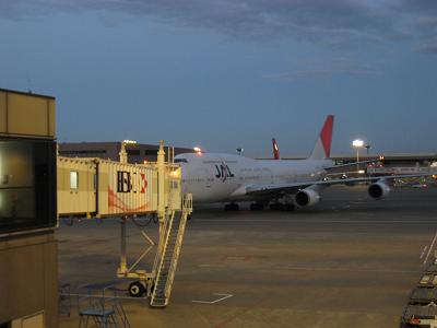 7:00pm departure, and takeoff at 7:20pm, went through a 45 minutes flight On the way, I get to see Hamamatsu city, and then turned north toward the airport. The B747 of JAL flight has a front looking camera which can be shown inside of the plane so we can see the airport. It landed at 8:00pm, taxied toward the south half of the terminal building and arrived to the gate. It's time to get off. Walking on a hallway which has very much no view to outside. So I could not take a picture of the plane... The airport looks a lot smaller but makes me think that this is similar to the design when I arrived to Belgium Airport.
