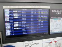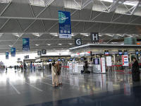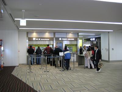 I could go buy and eat lunch while I was waiting for the train because I know the food is expensive once I arrived at the airport but I just did not feel like it. The train came to the station on time, and departed. The train stopped at Kanayama, and then kept going toward the airport. This time I get to see the surrounding. I get to see a part of Nagoya port, then arrived to Tokoname, then soon the train start crossing a bridge to the airport. I get to see the island, then control tower, finally the train come to stop at the terminal. I had to walk around to find the place to return the cell phone. I took a slope down to the down stairs for international arrival area, and returned it. Since I used only (? minutes) the total charge was (? Yen). I took a couple of escalators up to go to departing floor.
