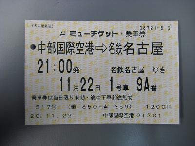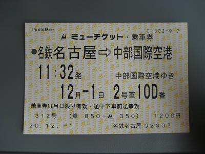 | Ticket to Central Japan International Airport from Nagoya | This time it is a limited express so the color is white and blue |