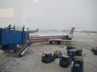 I just kick back and relax until my turn to board. It's nice that they have a pretty big flatscreen TVs at the lounge. The news such as an plane stuck at a side of runway at ORD, and FedEx is being available for package pickup on today (although it's a holiday today) to accommodate any delayed gift packages. The snow's been a big issue for the past few days. I also checked emails but nothing turned up so far. I will try to check again in Chicago. The sun was coming up as I was waiting. It was well passed the original boarding time of 7:55am, it started at 8:10am at gate 28. I had to make a line at jet bridge but a little tough to do since it is pretty cold outside. After taking a seat, I saw snow still falling. The plane departed at 8:30am, but had to wait on the pavement for a while due to traffic condition at Chicago O'Hare. The condition there maybe still bad. The plane started to move again after 10 minutes of wait, actually I was taking a nap during that time because I was relieved from the tense morning traffic.