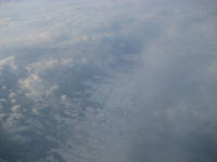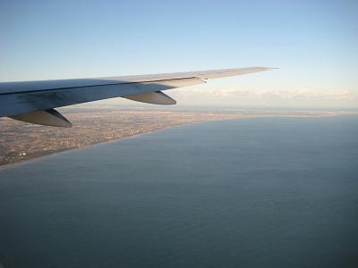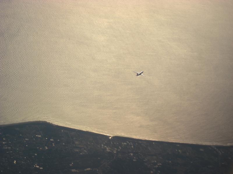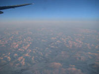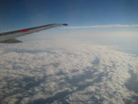 The plane pushed back at 7:00pm then took off from 16R at 7:40pm because there were about 6 planes waiting for departure so it was a long wait. Within a few minutes after taking off, the place reached to the shore line while keep climbing. At 8:15pm, the plane reached to FL360, with 250mph on the tail, we are expecting the delay will be cancelled out. According the captain of the plane, a cold front is expected to arriving to Texas area, so the weather maybe gusty when we get there. At 8:44pm, dinner was served. I was watching video program to show Venus and Alps. I think I want to there.