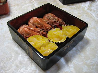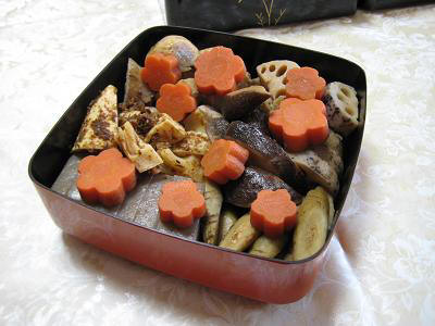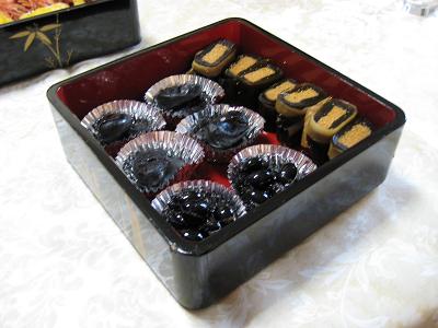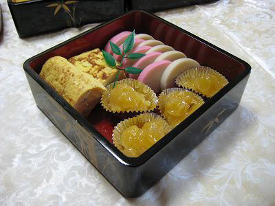| Black beans, fish egg filled sea weed roll | Rolled eggs, Red and White fish cakes, Maroons |