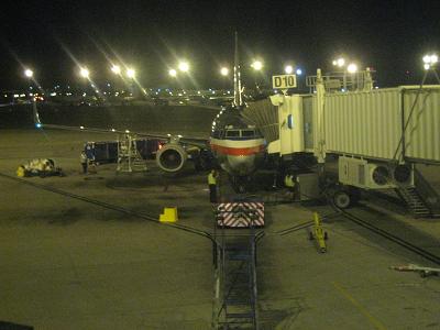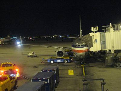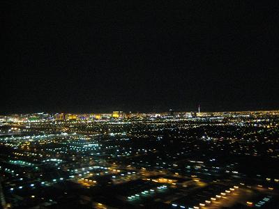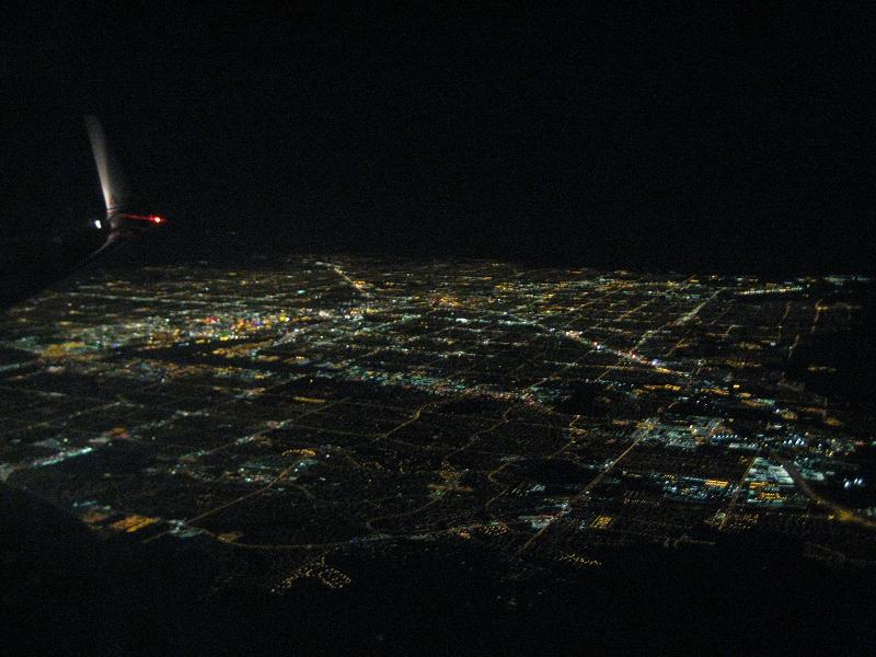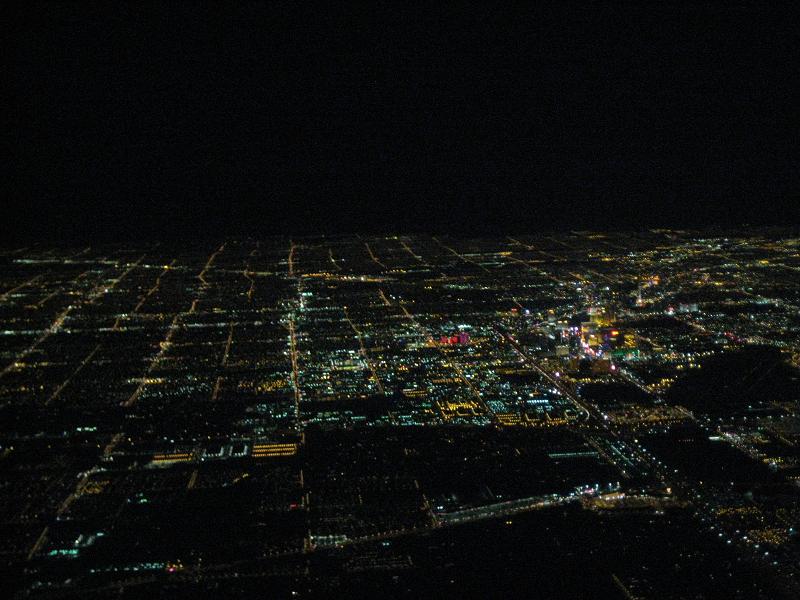 I walked to the gate at 9:25pm CDT. There are some passengers on standby list but does not affect me. I was able to get in the cabin for first class seating, and then waited for a while until the plane is ready for departure. The plane left the gate at 10:05pm on time, and taxied down the runway. It was already dark outside so I could not see much. Took off in the air at 10:15pm, flying toward north then turn to west. On the way to the Las Vegas was quite boring. I was reading magazines, looking outside but not much to see. For the later part of the flight, the plane had to maneuver around the cloud, that the time when I started to see some lights. After passing a couple of cities, I could see the Lake Mean in the dark. It was a bit hard to see but I could tell from the geographical features. Soon I start to see a huge blanket of lights to the northwest, The plane flow along the south side of it, passing a mountain range then turned to the north. The plane adjusted the course once more to west for the landing. I started to see the casinos and other buildings. At 10:42pm, the plane landed at Las Vegas airport. The plane taxied toward the gate but stopped before arriving to the gate. The plane currently at the gate was delayed so nothing I can do about it. I was tired so every minute I wait is a pain. After waiting for 30 minutes, we finally get to the gate.
