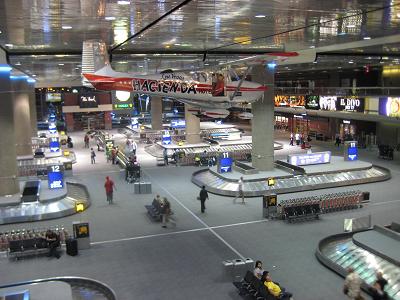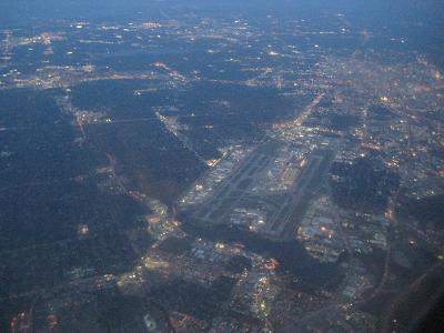 The boarding started around 6:50pm, I got on the plane, it departed on time and took off at 7:35pm to north then turning to south. The air was pretty moist and I could not see much of the the view. The plane had to fly at 25,000 to 30,000ft since strong south wind present at high altitude. Due to the weather condition, I did not get to see much of the places. The moon was coming up as the plane head to south. It was quite a view. The plane started its descend at 8:20pm. It flew east of the airport, passing by Dallas Love Field airport and downtown. The plane landed at 9:00pm, getting off the plane at 9:10pm. Because the connecting flight is leaving at 10:05pm so I don't have much time. Walk to the Skyline station, and transferred to the terminal D.