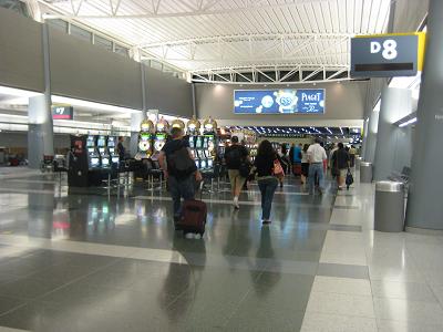 After getting off the plane, the first scene I saw was people waiting to board, some sleeping on the floor, and rows of gaming machines at the terminal lobby, very much at everywhere. The stores there were all closed, so I was just following the ground transportation sign. The guide book suggested that I should take a taxi to the hotel from the airport for $20, but when I asked a person at the information desk, he told me to take a shuttle, which is only $6.50 a way.