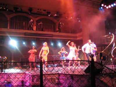 While driving down the street, I get a good view of Bellagio, Caesar's, Monte Carlo, Wynn, Encore and others. We turned to west, the guide took us to one of off strip casino. They have a free show starting from 8:00pm called Masquerade Show in the Sky. After getting into the building, we walked toward a stage, and the show started at 8:00pm. The first half was dance at the stage then gondolas hanging from the ceiling was dropping the beads. Guide knew the path so everybody in the tour get their share. We started to walking toward the exit and got out from the building, still pretty windy so the guide told us that we may see the water show. It's a bit disappointing but we will see then. We got on the bus again.