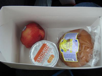 After check in at a counter, they gave me a blue sticker. waited in a lobby for a while. At the airport, I could see some planes with Vision logos on it. I guess the company is not that small. Within few minutes, we got called and went outside. We lined up and get on board a bus. Each passenger received a breakfast box containing an apple, muffin and a cup of orange juice. I was able to take a window seat (on left hand side, which was a right decision) The bus left the parking lot at 7:25am, heading to a nearby freeway. Let the tour start!