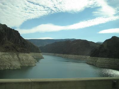 Getting on the bus breakfast (orange juice, banana muffin and apple) The bus took I-515 to the south, heading toward Boulder City. The interstate was over and now it's state road 93. Soon after Lake Mead is appearing to the left, the bus stopped nearby Hoover Dam for security screening around 8:00am. They have implemented this process after 9-11. We were asked to open all cabinets and inspector came in, checking the restroom and cleared us. While passing the dam, the guide told us that when a new bridge being built is finished, we don't have to do this anymore. Also they had a overflow water way which is pretty huge. Making a short stop at 8:15am after passing the dam. I took some pictures. Left at 8:30am