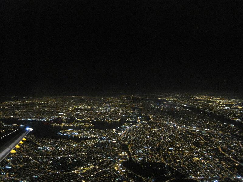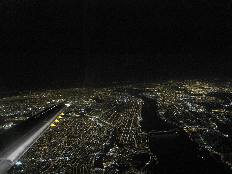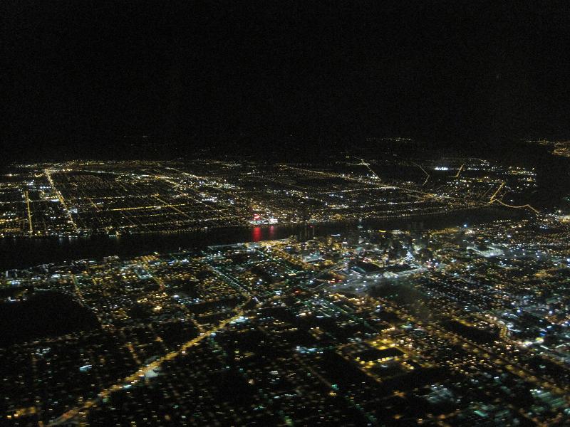 Departing at 8:00pm, the captain told us that we will be having a nice view of New York on the way to Detroit. The plane was at 18th position so the take off was at 8:30pm. The plane took off to northeast, then flew north of the New York City. It was a beautiful view. I had nothing to do so I was typing a draft of my trip journal. When an announcement to prepare for landing was given, the plane was flying north of the Detroit downtown, I could see the buildings. Plane changed the course from west to south, and landed at 10:00pm with very short stop, about 2,000ft. Everybody in the plane was pushed toward the front. It was a hard one. The plane taxied to the gate.