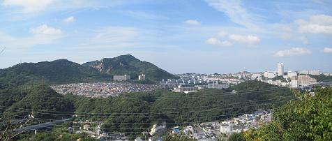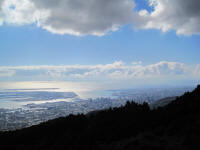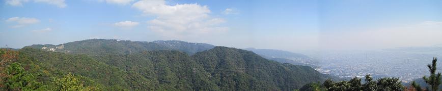 Mt. Hachibuse(9:30am) -> Looking toward east On the way to the top of the mountain, I had to stop for a rest because I was out of breath and sweating really bad. I looked around and saw the view toward Suma to the east and Akashi bridge to the west. It's nice to be I was passed by older man and lady while I was taking a break. They are climbing like a regular thing.