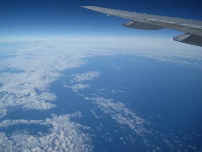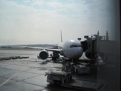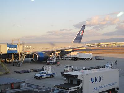 Arrived at the airport, lined up to check myself in. While I was getting my tickets, my coworkers managed to get access to the lounge. We went down to the 2nd floor for gift hunting. I wrote a couple of postcards, and put the stamps on and dropped in a postal box. Since my coworker wanted to bring more cigarettes, I had to help him by carrying one. Took a tram to go to gate 10, and met up with my coworkers. The boarding started so I got on the plane, the B777-200 for United Airline was a bit old but having only two seats instead of three by the window helped.