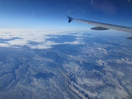 The flight was mostly smooth but sometimes came under turbulence. The first one started around 8:20am as it climbed to 36,000ft. The plane flying over the plain 8:50am, as the ground was getting partially covered around 9:13am. Reached to rocky area at 9:22am. Turbulent again around 9:46am, and again around 10:20am. Around 10:00am, the plane was flying over canyon area, and mountain area at 10:20am. The plane first slow down around 10:45am, then soon started the initial descent as it approached Sierra Nevada mountains. I saw Tonopah Test Range on its way at 10:53am. Flying over Sierra Nevada at 11:11am, and kept going west. Flew the south of San Francisco then turned to the north toward the airport.