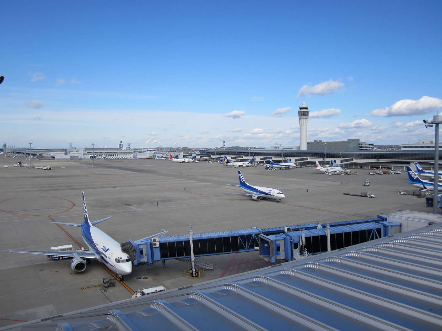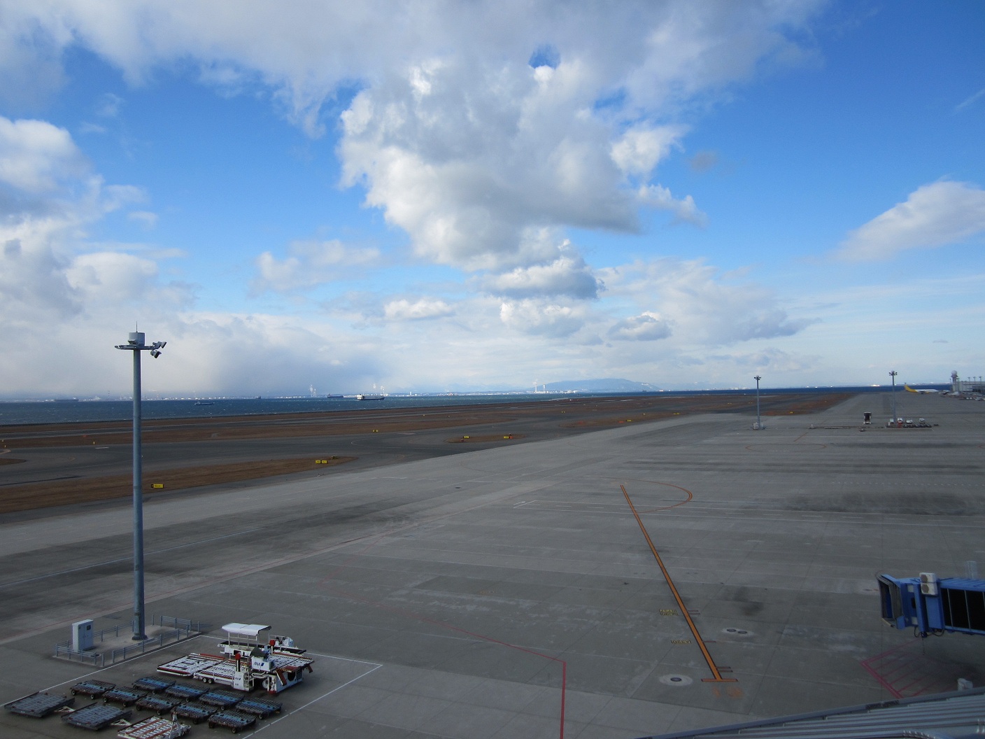 After walking to the check in counter, I had to go through the baggage scan, which came out to be okay. Got my ticket with the seat I could see Mt. Fuji. Since I had some free time, I went up to the deck which was very windy. I could hear the fall protection wires along the deck perimeters are making hissing noise because of the strong north wind. It was not quite the clear weather but I could see Yokkaichi and mountains beyond. The west view was obstructed by clouds which looks stormy.