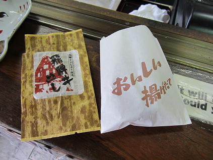 Snacking on rice ball (left) and croquet (right)