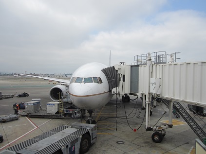 Arrived at the gate E20 at 8:30am, The boarding soon started and because I got upgraded to the first class, I was one of the first person to get in. It was nice because I could relax in the comfortable seat for 4 hours before another flight to Japan for 10 hours in tiny economy seat. The plane departed on time, get pushed back at 9:15am and I am ready to go. The plane taxied to the runway and took off to the south at 9:35am, turn to right toward Los Angeles. The guy next to me wanted to take a nap so I shut the window. The air got turbulent for a moment, then the breakfast was served at 10:30am(CDT). The plane was flying over New Mexico at 11:00am(CDT). The air was a little turbulent for very much entire period of flight, the plane finally slow down at noon(CDT), just 190km away from San Francisco. The plane kept going to west and I began to see the populated area from the window, landed at 10:20am PDT, taxied for a while and arrived at the gate at 10:27am PDT. Due to the construction of the building, the plane needed to be towed to the gate....