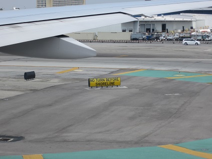The plane taxied to the runway which had a sign says "NO TURN BEFORE