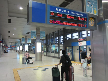 After getting off the plane, I tried to call home with my cell phone again but still not good. I decided to get on the train first. I picked up my bags and left the baggage claim area. I saw many people waiting for someone they know to come home at the exit, it's a usual site, everywhere, every time. Bought a MuTicket to Nagoya, tried to get on but I could not pass the gate since my Manaca was not used for more than 6 month. I was at the platform a few minutes before the train leaves. Get on the MuSKY #247 leaving at 6:37pm, the outside was still bright, the train move through the familiar sights and arriving at Nagoya station at 7:05pm.