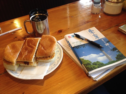 Having lunch at Japanese Cafe while reading walking-tour book about Tokyo