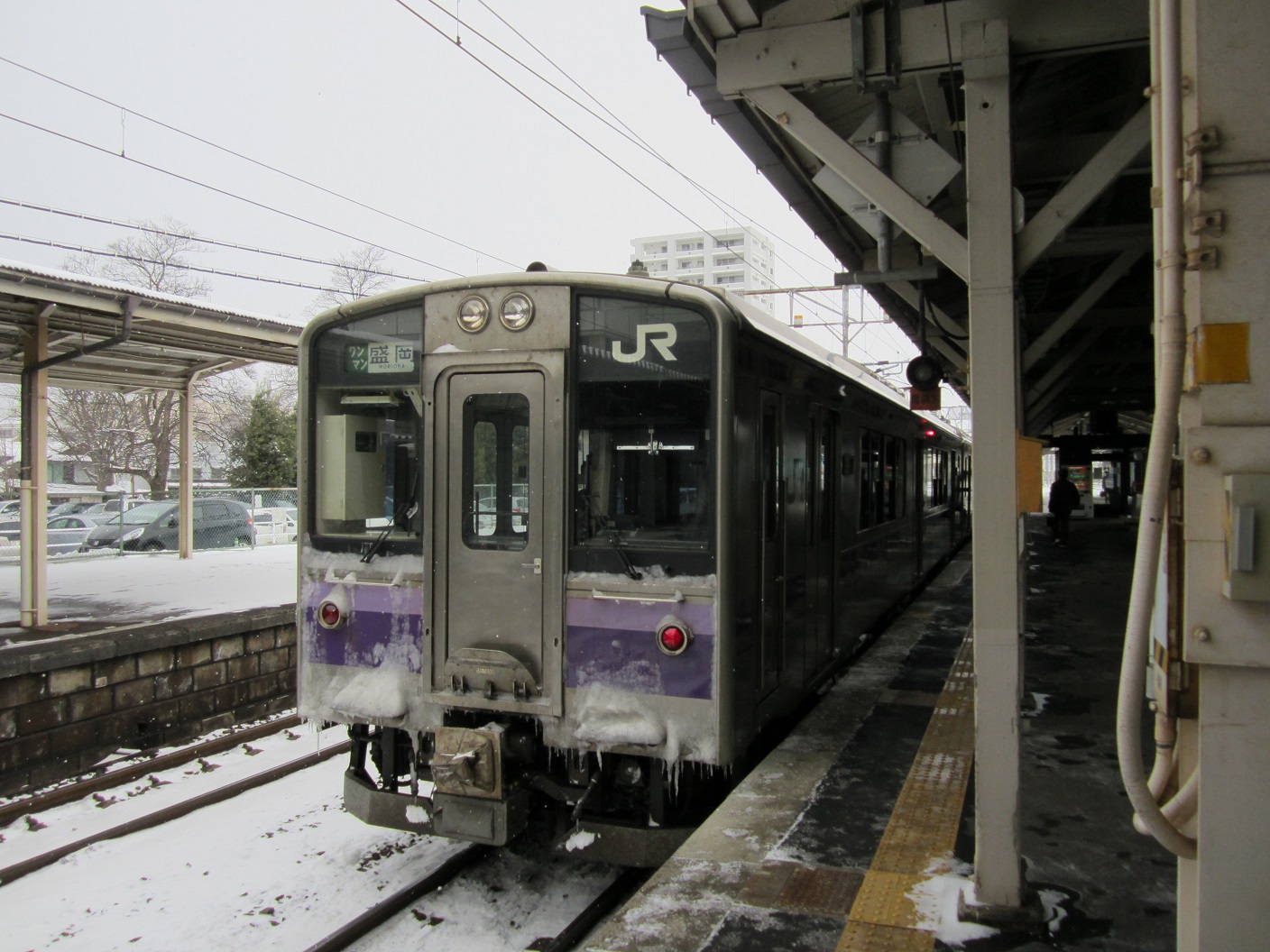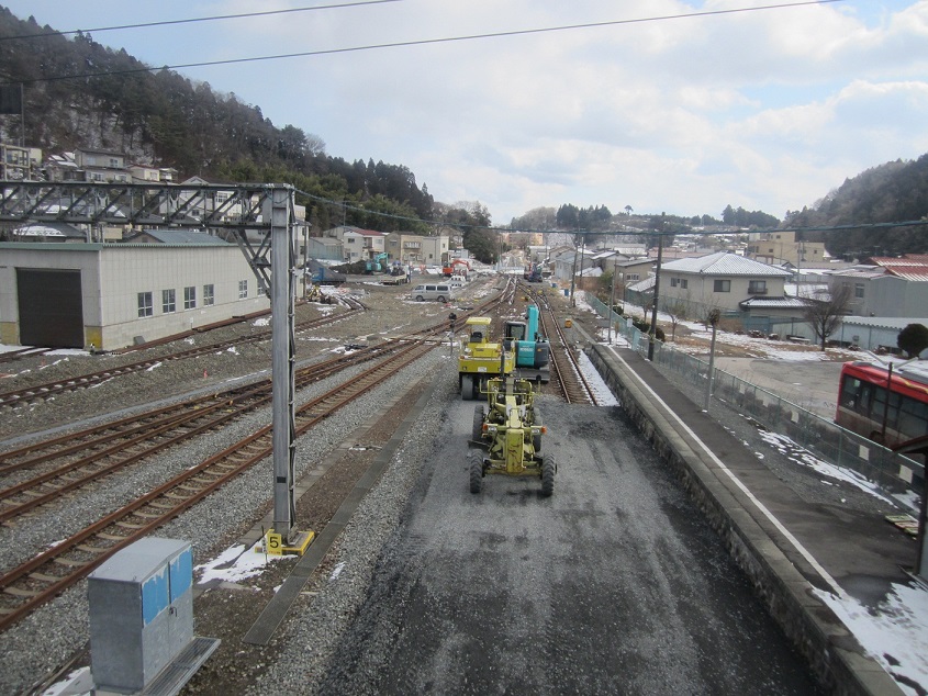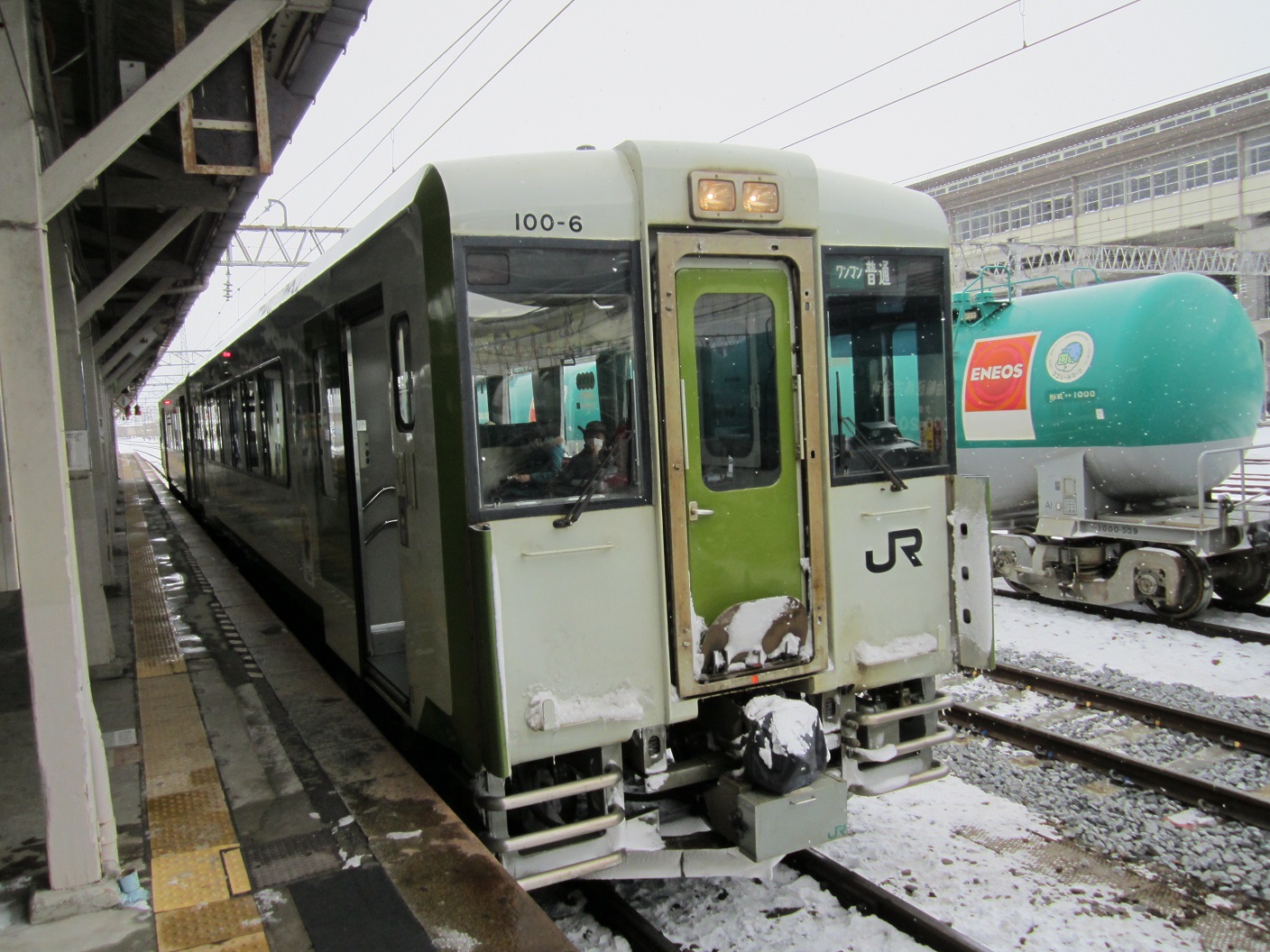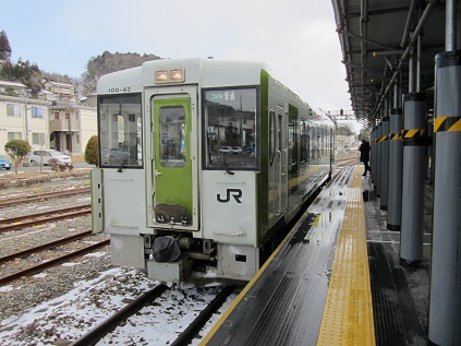Arrived back at the Kesennuma station at 12:08pm, picked up my bag from a locker and get in the train. The local train, which has only one car, left Kesennuma station at 12:20pm. It was another long train ride, making stops at every stations. The outside is snow covered and more than yesterday's. The train slowed down and entered the platform at Ichinoseki at 1:42pm.