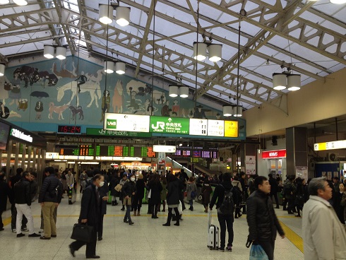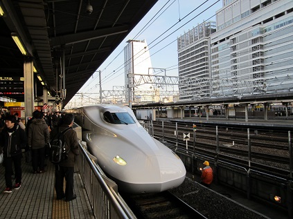 The Nozomi 302 leaving Nagoya 7:39am was late by 5 minutes because of the snow in Maibara area. The train was washed to clear snow on the body and proceeded. The train moved under partly cloudy weather, I could not see Mt. Fuji because it was cloud covered. The train was supposed to arrive at 9:20am and I thought it would be at 9:25am but actual arrival was only 1 minute delay.