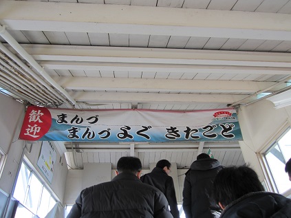 | Kesennuma Station Sign | Welcome, Manzu Manzu Yogu Kitagodo... |