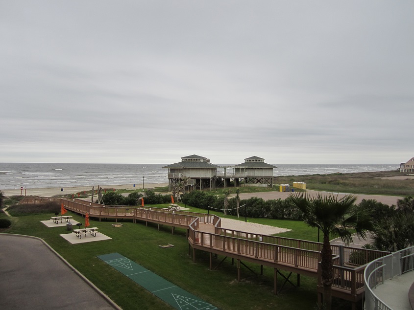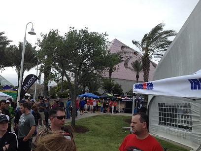 I walked to a tent for check in, there were about 20 people in front of me waiting windy bay area with surfs crushing nervously, by the time the check in started at 10:00am, maybe 200 people lined behind me. I signed my wavier and got myself tagged with a blue band, also picked up bag and other goodies. Afterward, I walked around and bought a bike jersey with Ironman 70.3 Texas logo. Attended the first orientation then left there around 11:00am to grab a lunch at McAlister. The outside was now overcast and windy. Stopped by at Kroger for groceries before driving to check out the bike course prior to the race. I had to pay $4 to cross and back the San Luis pass bridge. Back to the Moody Garden around 2:30pm to drop off my bike and rain proofed it before leaving to the hotel.