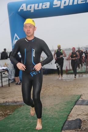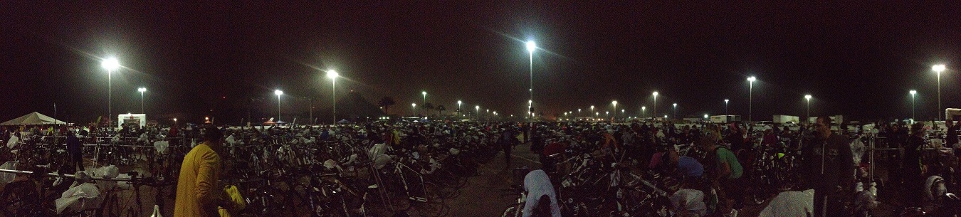 Woke up at 4:00am, checked the weather on the TV and internet, looks like we are good to go. Left the hotel at 5:15am under dark sky toward the Moody Garden. Parked nearby the transition area and walked to the area to check gears and setup for the race under still dark sky. Rain came sometimes, and occasionally the lights to the area went out. I had concern that the swim portion maybe cancelled but it did not get that bad. Get changed into wetsuit and left the area by 6:45am then walk toward the starting area. The path was paved but the surface was pretty rough so it was a bit tough to walk.
