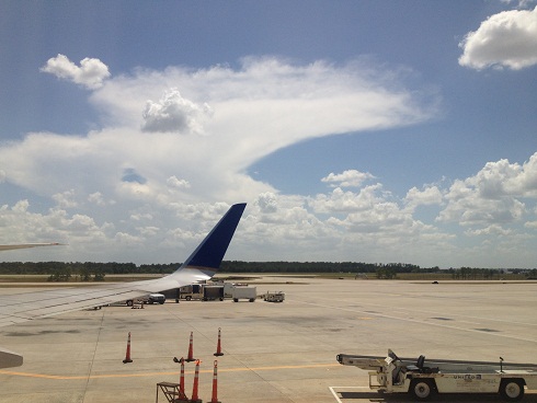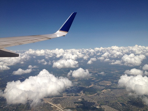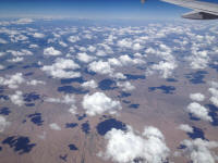 12:55pm, getting on board. The plane was pushed back at 1:12pm, taxied to the west end of the airport and took off to east at 1:22pm, giving me the last glance of Phoenix and Camelback Mountain. The weather was nice but the captain was reporting that some disturbance on the way, then around 2:10pm, I started to see some stormy looking clouds and lasted about 30 minute. The plane began slowing down at 4:55pm, the captain reporting 200nm out. Another announcement was made at 5:08pm for 90nm out. Flew over collage station at 5:11pm, and the plane approached from the west for landing at 5:27pm. The bad thing about landing early is that the plane cannot get to the gate since it is still occupied. We were sent to a pad area and waited for 5 minutes before moving toward the gate.