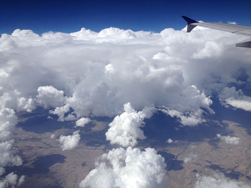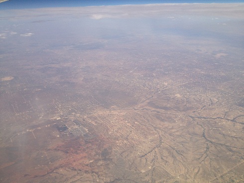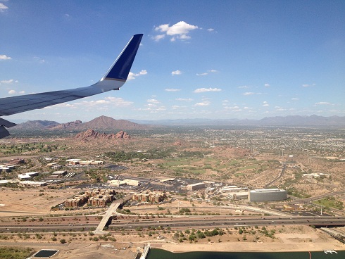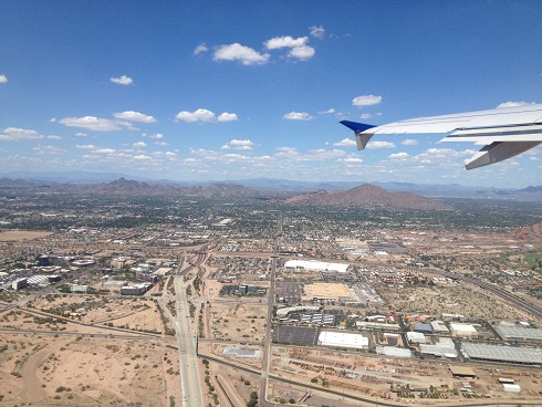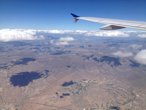 I let my friend know that I get on the plane by text. The seats were very much full and there is a big guy sitting next to me and I cannot move around so I decided to just watch outside while waiting for the departure. I can see the stormy cloud far away. The plane departed at 2:10pm, taxied to a runway at west side and took off to the south then turned to right before breaking off from the lower cloud level.It flew over North of Austin at 2:40pm, Crane, TX at 3:15pm, North El Paso at 3:47pm, Descent began at 2:00pm at Phoenix time, 4:15pm at Mt. Graham, Queen Creek 4:30pm, Super Stition at 4:35pm, landed at 4:38pm. The plane taxied to the terminal.