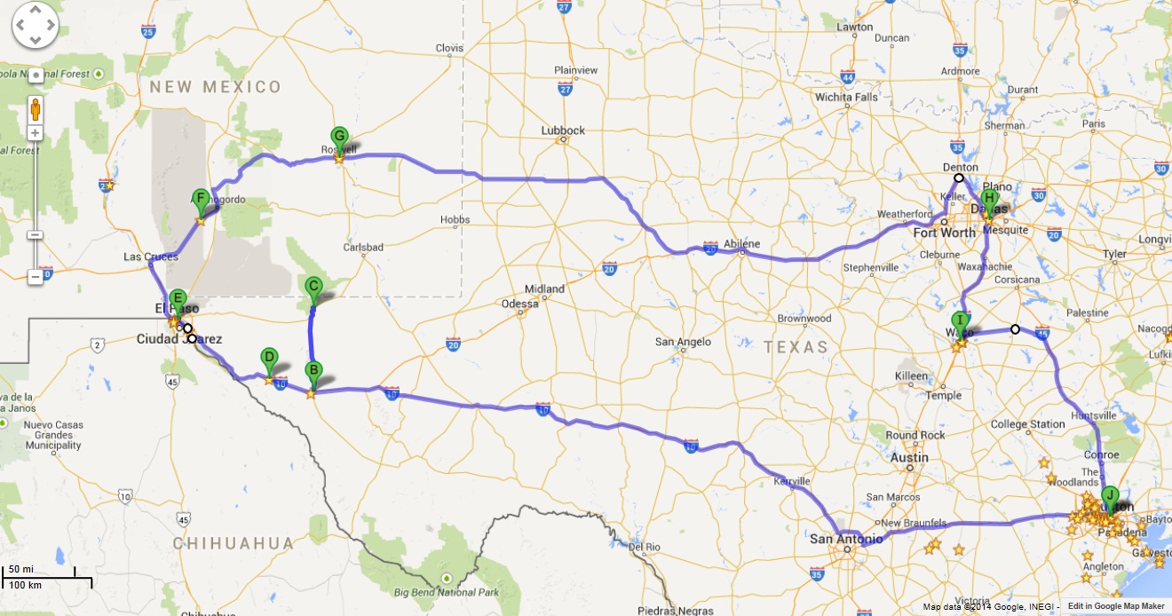 Left the park and began head to Roswell. I stayed too long so it is going to be totally dark when I reach there. The fuel was getting low so I stopped at the nearest town, Alamogordo at 4:12pm, 1014.9mi, to fill up. I then headed north on US-70 then turned right at Tularosa to enter the mountain area. The road became winding one and proceeding between mountains. Drove by Casino Apache; must be operated by Apaches. I kept going with precaution but some car could go faster than me. Once exiting the mountain area, the road became straight toward Roswell. It was nice seeing stars as I was driving down the hill. Arrived at the downtown area, had dinner at Peppers for Taco Salad around 6:30pm, left in 30 minutes because I was tired and wanted to check in at the hotel. Checked in at the holiday inn express 8:00pm, Worked out for 20 minutes then went to bed at 10:00pm. 1135.6mi, 37.6mpg,13:12? arrived at the hotel at 9:20pm?.